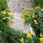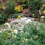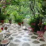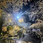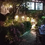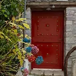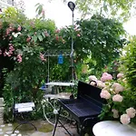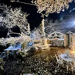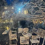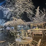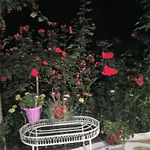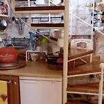 The kitchen amenities at the accommodation feature an electric kettle, a refrigerator, and kitchenware, provided in an outdoor dining area.